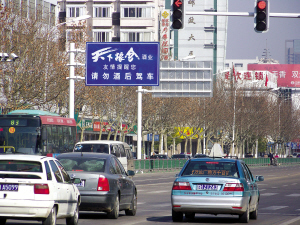 導(dǎo)讀:淮安淮海南路上,某酒廠打出的廣告都上到了交通指示牌。