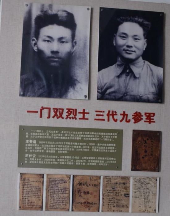 在盱眙縣烈士紀念館內(nèi),書寫著一副挽聯(lián):“一門雙烈士,三代九參軍”。這是對盱眙縣王達才一家積極投身革命的真實寫照。為了追求真理,為了中國革命的勝利,王達才一家三代共有9人先后參加到革命隊伍中,其長子王贊虞、次子王仲安分別在抗日戰(zhàn)爭和解放戰(zhàn)爭中血灑疆場。